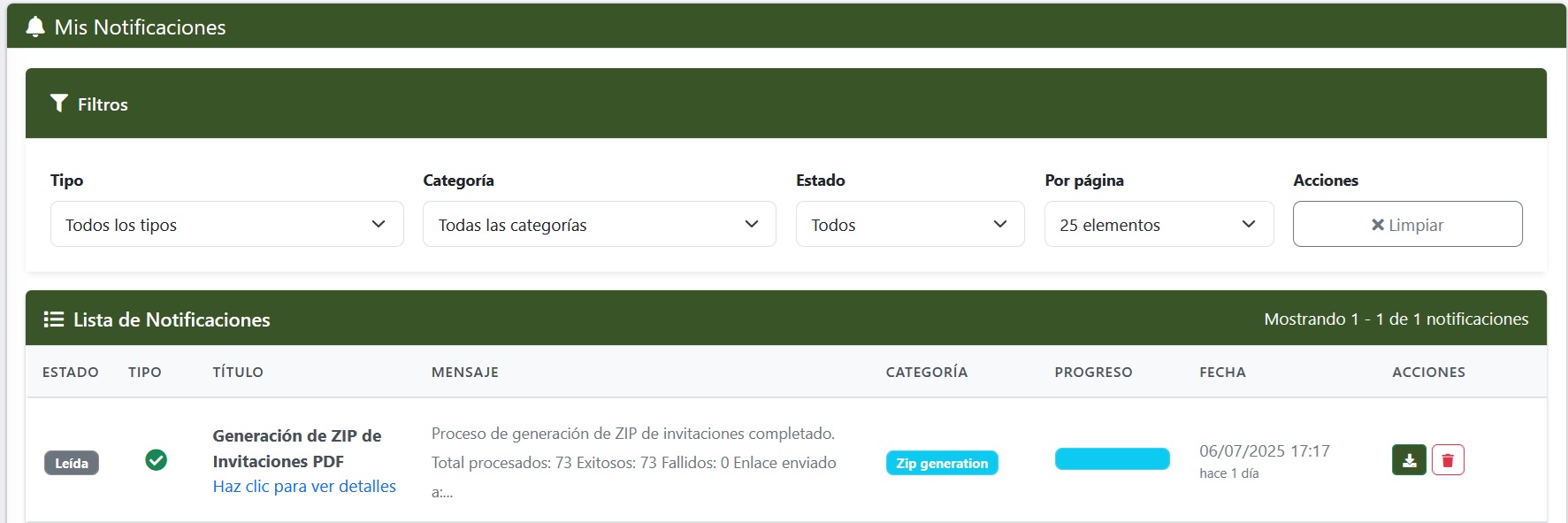 • Nuevos menús superior de últimas notificaciones y lateral con el historial de notificaciones no borrado. En ese historial se registran las acciones masivas y los errores a gestionar. Ejemplo: