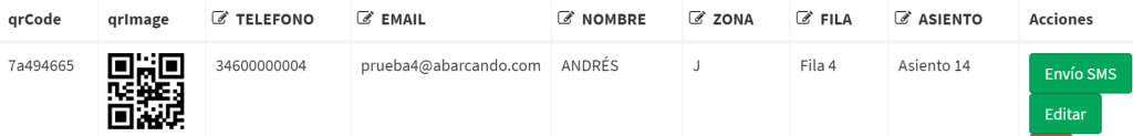 Se puede hacer ambas cosas: para hacer un envío por SMS individual, se pulsa en [Asistentes] > [Envío SMS] en la línea cada ese asistente concreto al que se le desee enviar SMS con la invitación QR.